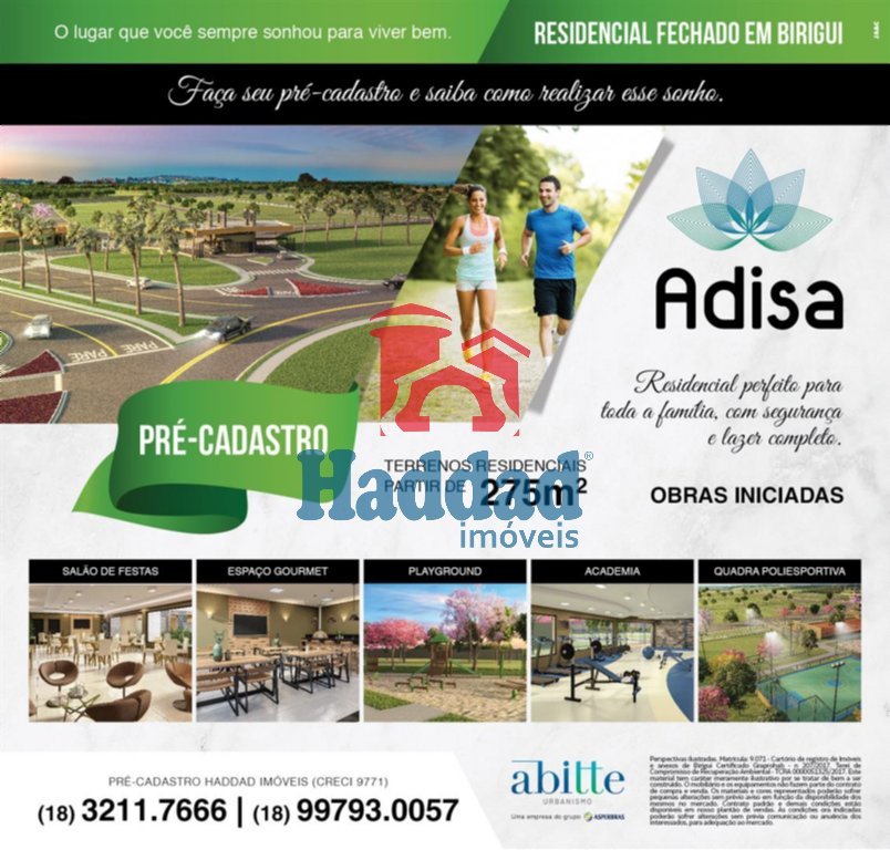 CONDOMINIO RESIENCIAL ADISA BIRIGUI – TERRENOS RESIDENCIAS A PARTIR DE 275,00 METROS QUADRADOS, ENTRADA FACILITADA, PAGAMENTO EM ATÉ 180 MESES, , COM PORTAL DE ENTRADA, QUADRAS POLIESPORTIVAS, PLAYGRONUND, PET PLACE, ESPAÇO GOURMET, ACADEMIA, SALÃO DE FESTAS, AREA DE CONVIVENCIA, OTIMA LOCALIZAÇÃO, FACIL ACESSO AS RODOVIAS.Ref. 13063 R$ 109.000,00 Haddad Imóveis 3211-7666 Creci 9.771-J.2ª Região